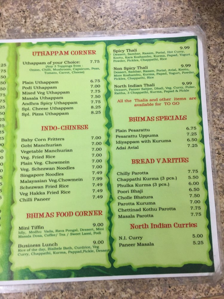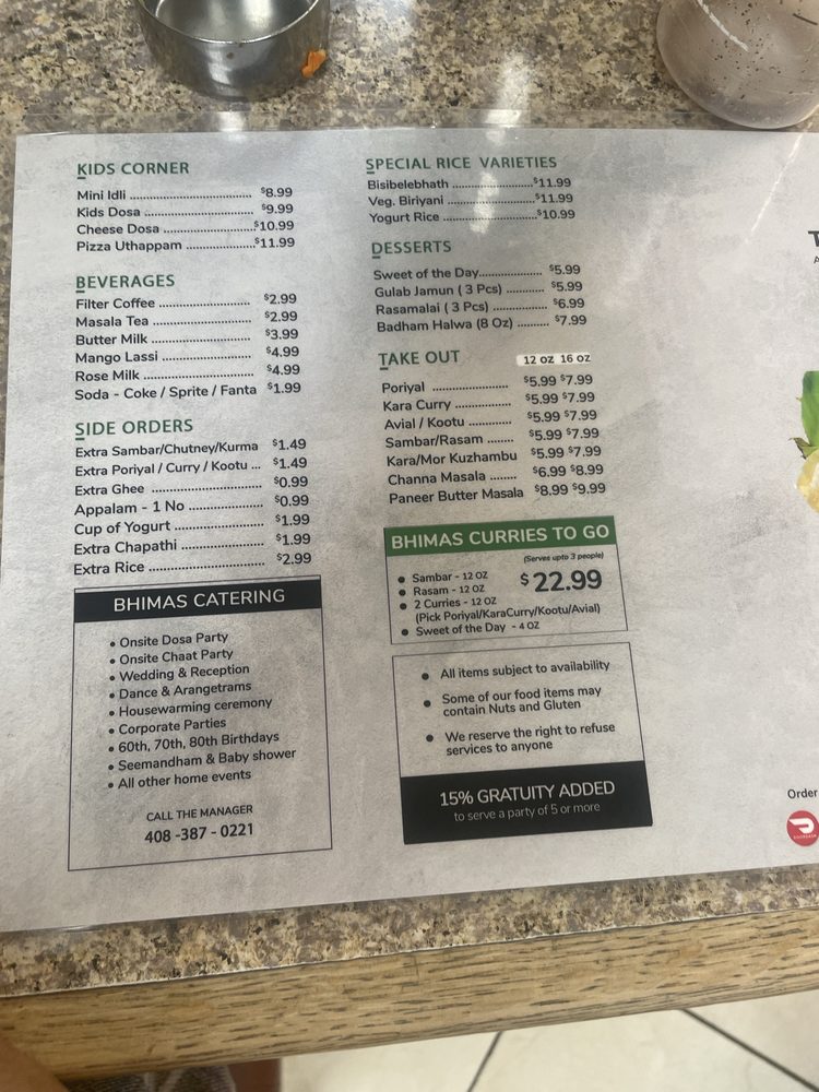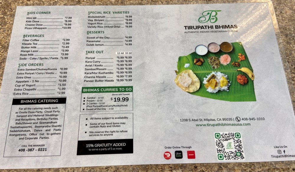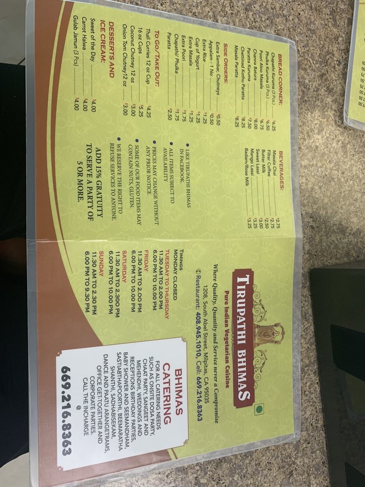 "Tirupathi Bhimas" in Milpitas is a bustling South Indian restaurant known for its authentic flavors and extensive menu options. With a focus on vegetarian and vegan dishes, this restaurant offers a range of choices from spicy thalis to non-spicy options, all prepared with care and attention to detail. Customers rave about the Andhra Spicy Thali, Non-Spicy Thali, and Idiappam, giving them top ratings for taste and quality. The staff is friendly, the ambiance is inviting, and the service is exceptional, making it a favorite spot for many in the Bay Area. Whether you're a fan of South Indian cuisine or looking to explore new flavors, "Tirupathi Bhimas" is a must-visit destination for a flavorful and satisfying dining experience.